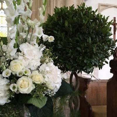 | A | Sue Huckle says: Giant bay trees with twisted stems look great and create a real statement at any venue. The dark green of the foliage creates the perfect backdrop for flowers, as you can see in this picture with the cream and white arrangement. Imagine the scene without the bay tree, and the flowers wouldn't stand out so well against the stone pillar, yet the contrast with the green is lovely. Everyone is so conscious of the health of our planet, and here at Posh Plants, we can enable you to decorate your wedding in the most eco-friendly way possible. Our trees have been a living part of the large Posh Plants collection for almost 20 years, and some of them, like these giant bays, were 20 years old when they came to us. So, these established, mature trees have been absorbing CO2 and giving us back oxygen while they work hard to make your special day the wedding of your dreams. |