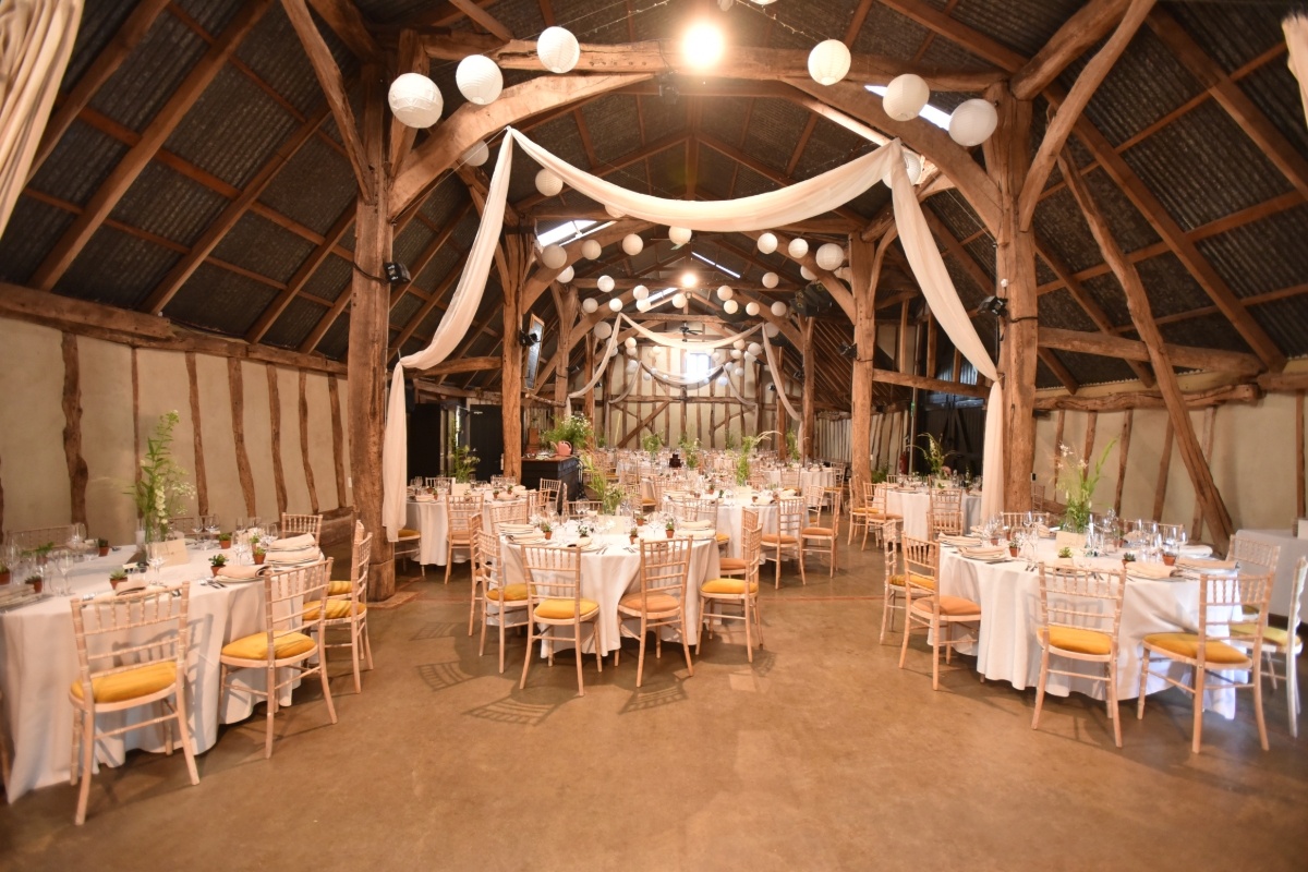 Ceremonies are held in the West Barn, which includes a handmade oak ceremony table, full aisle and a beautiful stone floor. Receptions take place in the South Barn, which is the largest and oldest of the two. They're both connected, so there's no risk of guests getting wet if the weather's bad. Complete with a bar area, room for a band or disco, as well as tables and seating for the wedding breakfast, it provides a flexible space for parties of 60 up to 250 of your family and friends.