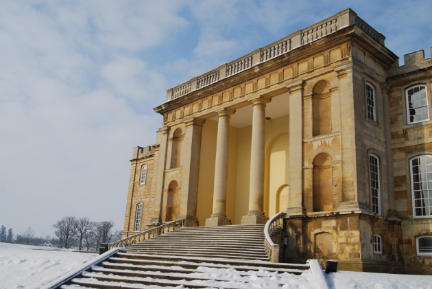 Kimbolton Castle, front of historic building with steps leading down to snow covered lawn