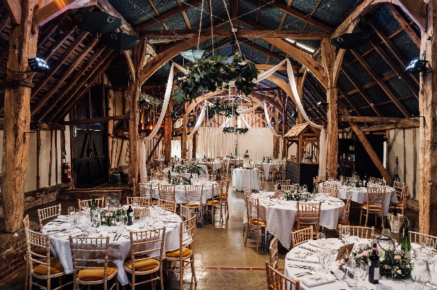 Post-vows for up to 250 guests, the main South Barn provides all the space you need for your wedding breakfast, bar, band or DJ and dancing. The barn, with its timber-framed walls, flowing silk drapes and thousands of fairylights, hanging 'hoop' lights and vintage ladders (all with pendant rope lights), is a beautiful backdrop to photographs.