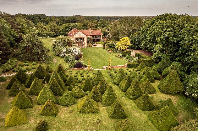 Chaucer Barn, set in the rolling hills of North Norfolk, is offering 2023 mid-week weddings at half price! Chaucer Barn is a traditional flint barn, built in 1836. The East wing is a contemporary conversion of the old flint milking parlour, featuring a two-story wall of glass which runs along the complete length of the west side in order to show off the stunning view over the main lawn, with it’s topiary pyramid forest and parkland with woodland behind.