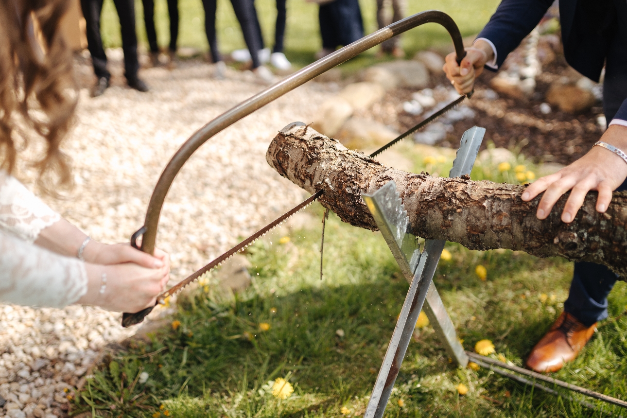 The bride and groom use chainsaws: While still wearing their wedding attire, German newlyweds are sometimes known to saw a log into two pieces during the ceremony. This tradition is known as Baumstamm Sägen. As it's a two person saw, Baumstamm Sägen symbolises the couples strength as they face challenges in their marriage.