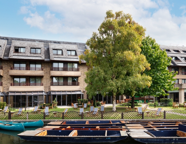 Graduate Cambridge’s crowning glory is its Garden Terrace. Relax on comfy, classic chairs while enjoying the punts go by with a beer or cocktail from the Garden Bar. Blue and white-striped parasols dot the garden, and across the river, guests can look out at the green fields of Cambridgeshire, where cows come to graze.