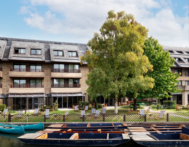 Graduate Cambridge’s crowning glory is its Garden Terrace. Relax on comfy, classic chairs while enjoying the punts go by with a beer or cocktail from the Garden Bar. Blue and white-striped parasols dot the garden, and across the river, guests can look out at the green fields of Cambridgeshire, where cows come to graze.